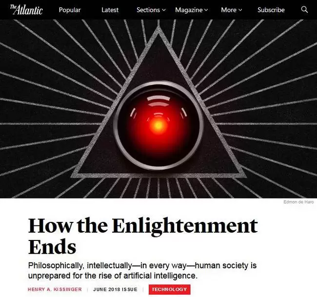 美国前国务卿、外交家、国际问题专家亨利·基辛格在2018年6月号美国《大西洋月刊》杂志刊发评论文章:《启蒙如何终结》。他认为,“无论从哲学层面来说,还是从人类智力层面来说,乃至从每一个层面上来说,人类社会还没有为人工智能技术的崛起做好准备”。
