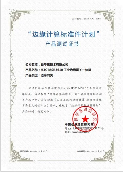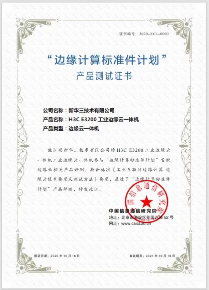 10月16日,在2020工业互联网网络创新大会上,中国信息通信研究院发布了工业边缘计算标准件首批产品评测结果,紫光股份旗下新华三集团工业边缘计算解决方案的两款核心产品——工业边缘云一体机和工业边缘网关一体机顺利通过测评,且在测评中展现出不俗实力,是所有参与评测产品厂家中测试项通过率最高的厂家之一。