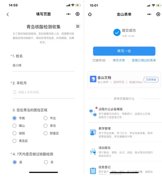 金山办公旗下「金山文档」、「金山表单」、「金山会议」三大产品,能够在特殊时期助力用户安全高效办公,即时统计健康信息,为帮助青岛乃至全国做好防控工作,持续防范疫情输入和反弹。