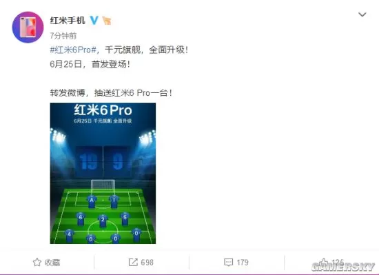 今日,红米手机官方微博正式宣布,红米6Pro将于6月25日(下周一)正式发布,号称千元旗舰,全面升级!在预热海报中,我们可以看到“19:9”的比分,言外之意,红米6Pro的屏幕纵横比确认为19:9,全面屏无疑。