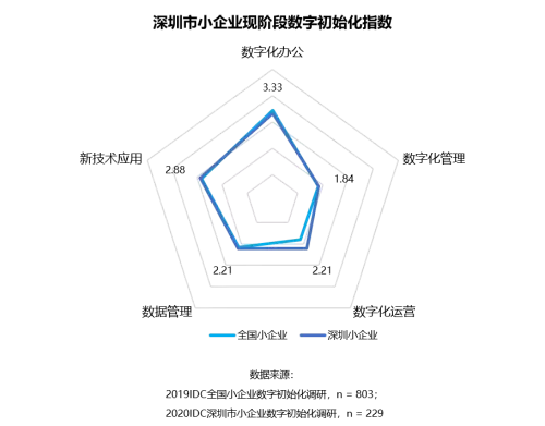 步入数字经济时代,数字化水平成为影响小企业生存的众多因素中的重要一环。最有标志性的事情是,在戴尔联合IDC推出的《2020中国小企业数字初始化指数 深圳特别版》中,指出超74%的深圳小企业数字化成熟度达到中等及更高水平,且深圳小企业整体数字化水平高于全国平均值。其中,数字化运营和新技术应用是推动深圳市小企业数字化水平的主要动力。