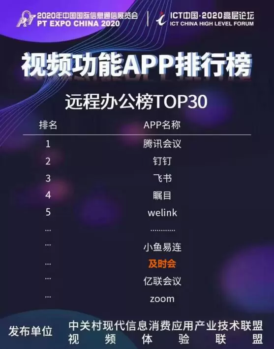 2020年10月14至16日,由工业和信息化部主办的“2020年中国国际信息通信展览会”在北京国家会议中心举行。其中,“5G+大视频产业发展高峰论坛”公布了“中国5G+视频功能优秀应用排行榜”,讯众股份旗下云视讯品牌及时会荣登“远程办公榜TOP30”。