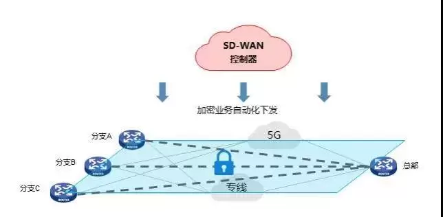 在5G网络之上,构建Overlay网络,通过SD-WAN方案对网络SLA实时监控,为业务流量制定最优路径。
