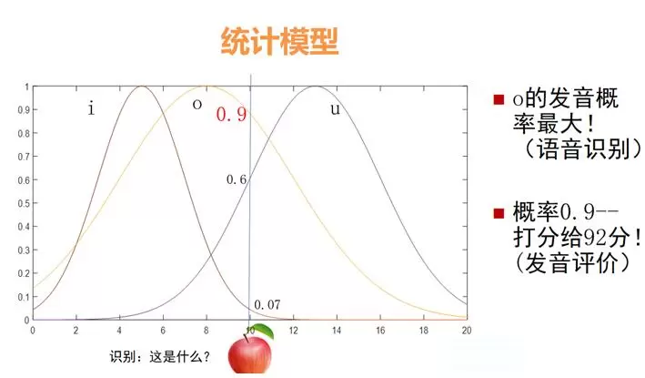 第2代智能技术的特点是基于大数据的统计。它的特点是首先需要采集成千上万不同的人的声音,然后对每一个音素进行统计建模,得出一个概率模型。例如,某个语言只有/i/,/o/,/u/这3个音,那么就需要首先采集成千上万不同的人对这三个音的发音,并且得出这三个音的概率模型。然后,当一个学生发了一个声音(假设是/i/),系统会把这个声音相对三个概率模型计算它概率(假如分别是0.9,0.6,0.07),然后可以根据概率的高低判断出发的这个声音是/i/,并且因为这个声音相对于/i/这个模型的概率是0.9,可以把它换算成90分。这就是第2代人工智能技术的用于语音识别和发音评价的原理。