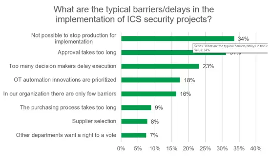 最常见的障碍包括无法停止生产(34%)和官僚主义做法,例如冗长的审批流程(31%)以及决策者过多(23%)。在COVID-19疫情的背景下,这些障碍可能会成为一个关键点,因为它们可能会影响由于疫情而需要部署的操作技术(OT)安全计划的实施。