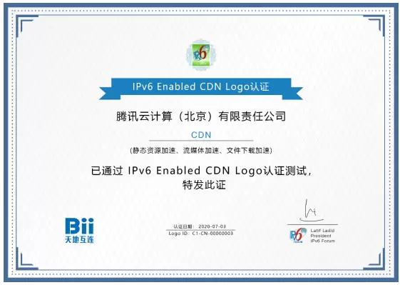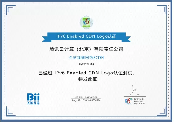 日前,腾讯云计算(北京)有限责任公司旗下CDN、全站加速网络ECDN在下一代互联网国家工程中心-全球IPv6测试中心(www.IPv6Ready.org.cn)正式通过IPv6 Enabled CDN Logo测试,荣获由国际组织IPv6 Forum颁发的IPv6 Enabled CDN Logo认证证书(Logo ID:C1-CN-00000003、4),标志着上述产品能够在IPv6网络环境下提供稳定可靠的加速服务。