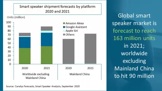 来自Canalys的新数据指出,中国大陆在最近几个月内,COVID-19大流行病已得到大部分控制,智能音箱出货量将强劲增长。该市场有望在2020年实现增长,世界其他地区大部分地区仍在与病毒作斗争,预计今年仅有3%的增长。