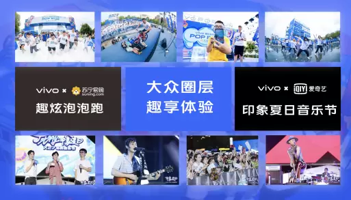 在这三个圈层,vivo针对性的进行资源覆盖,例如专门为精英阶层开设的”NEX100+“俱乐部,邀请了大量行业精英入驻,开展文化交流沙龙等;以乐趣共享为主的众多系列IP项目,像“趣炫泡泡跑”、“王者荣耀电竞盛典”,还有前段时间爆火的《乐队的夏天》衍生IP 岛屿音乐节,与大众圈层打成一片。