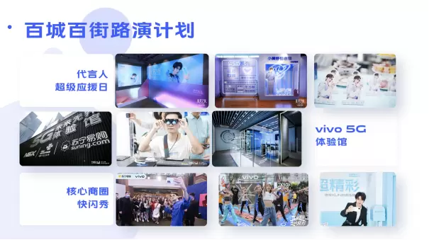 在明年,vivo将全面开放与品牌跨界联动,开启百城百街路演计划。在一百座城市、一百个商圈,一百个创意主题,与上万个门店一起进行上千场零距离的路演活动。覆盖全年的重要节点,加速渗透品牌年轻力。