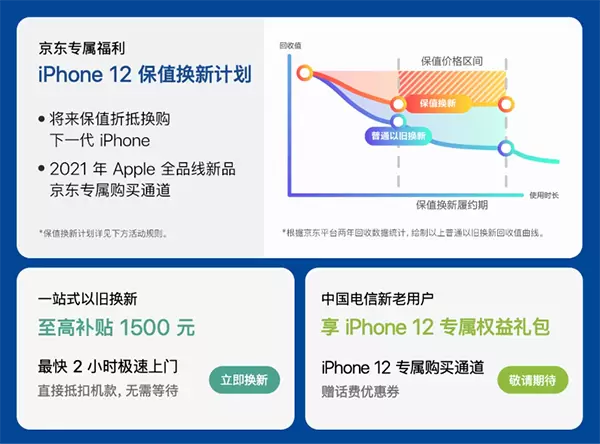 为了让大家能花更少的钱,体验最新的科技,京东针对iPhone 12为大家准备了诸多购机福利,包括“保值换新计划”、一站式以旧换新至高补贴1500元、1小时达、三大运营商专属12大权益、换修无忧、配件5折抢、Apple Music新用户4个月免费试用等7大权益。