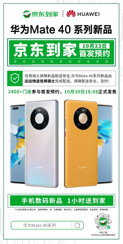 - 京东到家携2400+门店开启首发预约! 华为Mate 40系列发货后1小时送达