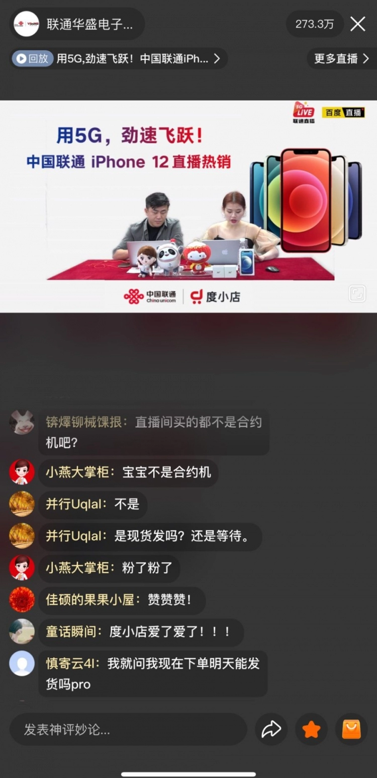 iPhone 12“未销先火”,上海南京东路的苹果店外甚至有黄牛加价1500元收购iPhone 12 Pro蓝色款。而在百度App购物频道直播中,iPhone 12原价现货发售,直播间还发放了三种不同面额代金券,用户可用于购买iPhone 12系列产品,在首发日各销售渠道中优惠力度最大。除此之外,幸运用户还可获赠耳机和充电器。