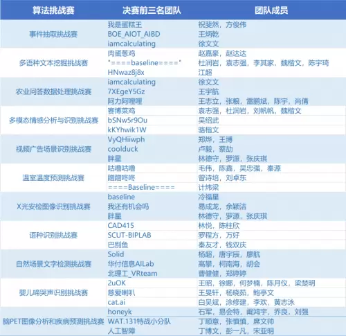在决赛路演的过程中,11个算法赛题的前三甲从各自赛题的解题思路、数据分析、算法模型及训练方案、优化方案等多个维度展开路演阐述与答辩,展开了一场算法模型的智慧演练。根据选⼿上传的数据结果准确率得分以及现场答辩表现,决赛前三名的团队名单公布如下: