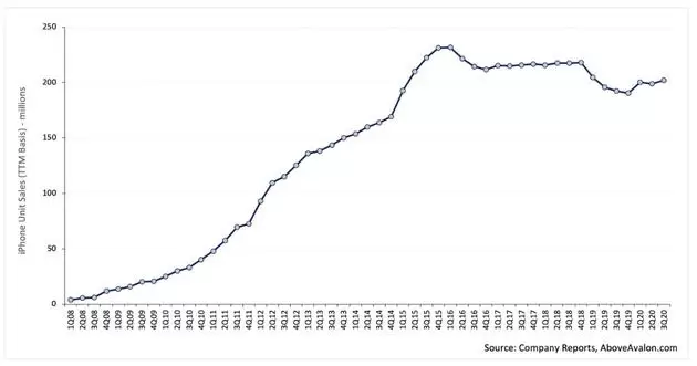 苹果公司已经有一段时间没有公开发布销量数据了,但根据AboveAvalon的数据,在2020年9月的某个时候,iPhone活跃用户已达10亿。如果这一里程碑是在9月30日达成的,那么距离第一代iPhone上市已有4842天,这就使得iPhone成为有史以来最成功的产品,但其销售速度似乎正在放缓。