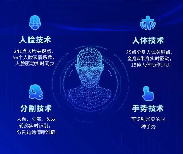其中算法能力包括人脸关键点、人脸表情动作检测、3D人脸模型重建、2D人体关键点、3D人体骨骼、人像分割、头部分割、头发分割、手势识别等。在人脸特效方面,相芯提供多达241个五官稠密点,尤其是对于嘴部和眼部这两个最"出戏"的部位,相芯提供了更加精准的点位,以保障应用层可实现更多的玩法。同时我们提供56个人脸表情系数以及25点全身人体关键点,能够实现虚拟形象从面部到全身的实时驱动,效果灵活逼真有趣。此外,人像分割、头部分割、头发分割等技术能精确地进行轮廓实时识别,且边缘清晰;15种人体动作识别以及14种手势识别,带来更多实时交互方式,极大地扩大了用户创作空间。