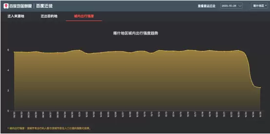 此外,当日喀什地区的迁徙规模和城内出行强度大幅下降,城内出行强度与公布出现无症状感染者前的10月23日相比强度下降近一半,可见人们防控意识的增强。据了解,百度地图迁徙大数据平台中的“城内出行强度”是该城市有出行人数与该城市居住人口比值的指数化结果,能够帮助疫情防控相关部门更直观、更全面地了解该城内居民的出行情况,进而合理开展防疫举措。