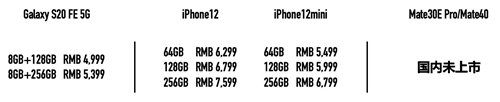 既然是三个品牌的新品,在产品方面也就多少都会有些不同,所以我们以价格相对较接近的几款产品来进行一轮对比,包括已发售的三星Galaxy S20 FE 5G,苹果iPhone12,以及还未正式发售的iPhone12 mini以及华为Mate30E Pro和Mate40,为广大近期有购机需求的朋友在双十一之前提供一些参考。