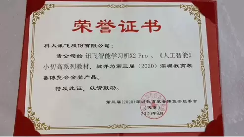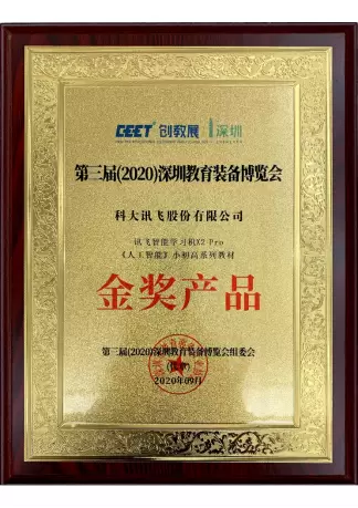 2020年9月18-20日,由深圳市教育装备行业协会主办的“2020第三届深圳教育装备博览会”在深圳会展中心举办。此次博览会举行了金奖产品评选,讯飞智能学习机X2Pro、《人工智能》小初高系列教材在此次评选中荣获了金奖产品奖项。