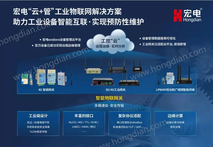宏电多年专注工业物联网领域,拥有独立自主研发的软硬件产品及系统,以丰富的合作伙伴资源、深厚的技术研发实力和顶尖的专家团队,为数百家知名制造企业提供物联网、云平台、大数据、人工智能等一体化的工业物联网解决方案,打破传统制造企业转型升级过程中的痛点和难点,帮助企业实现制造改革和数字化价值提升。宏电深入制造企业实际应用场景,提供工业级数据传输单元(DTU)、嵌入式数据采集模块、工业级路由器、智能工业计算机和工业智能物联网关(边缘计算能力)、iThings工业物联网服务器平台等一系列数据采集与联网物联网产品,解决制造企业提供设备接入、协议转化、边缘数据处理、运维等难题,为制造业千万量级的传统机械装备联网缺口及智能装备改造市场提供多网络技术的、可靠的、成熟的物联网数据采集全域产品及解决方案。