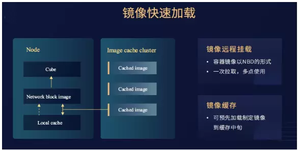 为了解决这种问题,我们实现了镜像缓存的功能。即用户的实际镜像拉取在第一次拉取中,会缓存在我们的镜像缓存中心,而后的镜像加载是直接通过NBD的形式直接挂载到Cube容器里,这样就可以实现Cube的快速启动,从而跳过了镜像拉取的时间。对于特别大的镜像,用户也可以选择预先加载的形式直接加载到我们的镜像缓存中心,从而进一步降低了启动时间。