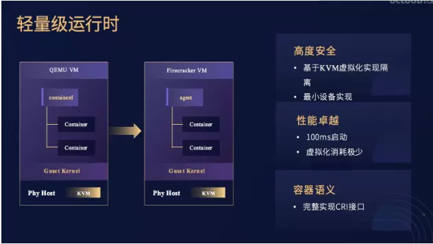 当然为了完全的比拟docker,实现的容器快速启动,我们在性能上也做了很多优化,比如将QEMU虚拟机换成了Firecracker轻量级虚拟机,仅实现了最小设备,进一步的降低虚拟化损耗。并且拉起速度能够降低到100毫秒。