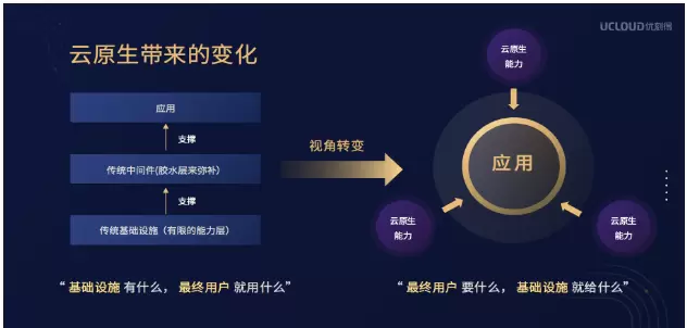 在云原生之前,用户从云厂商购买的是比较基础的计算能力和服务器资源,用户需要在此基础上一层层封装,最终来实现支撑自己应用服务的能力。而在云原生之后,云厂商则希望提供一种能够更加向应用靠拢的能力,用户仅仅需要关心应用,而其他所有的业务完全都可以交给云厂商来实现。