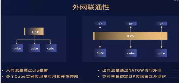 Cube的外网连通性也可以很好利用现有云平台的网络架构,对于入向流量,我们可以将Cube挂在ULB背后,利用多个Cube实例实现高可用和弹性伸缩;对于出向流量,我们也可以通过NETGW来实现Cube对外的访问需求。另外对于需要固定外网IP的情况,我们也可以将单个EIP绑定Cube。