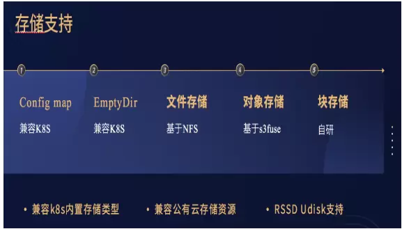 Cube的存储也可以很好的对标K8S,主要分为以下几类:一种是K8S内置的Config map Secret和EmptyDir,这些都是作为K8S标准的功能,我们也在Cube实现的CRI中纷纷予以了支持;对于云厂商提供的文件存储、对象存储,我们是通过agent的挂载来实现的,其中文件存储主要是通过agent自动挂载了NFS协议,而对象存储是通过agent挂载了S3fuse的协议;块存储是我们改动比较大的地方,为了提高性能,我们改动了Cube所使用的虚拟机IO路径。通过vhost-user协议,对接到SPDK实现了Cube上高性能RSSD云盘的挂载。