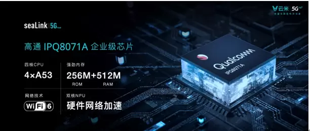 seaLink 5G Fixed WiFi 6路由器搭载行业顶级芯片——高通IPQ8071A企业级芯片,新一代WiFi6网络技术,还具备4×A53四核CPU+双核NPU硬件网络加速,以及256M ROM+512M RAM强劲内存、为家庭网络带来两大飞跃式改进。