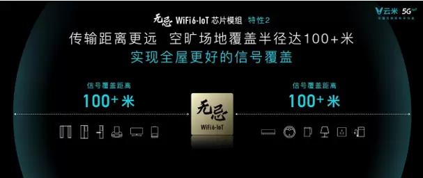 特性2:更远的传输距离,更广泛的全屋信号覆盖。无忌WiFi6-IoT芯片模组传输距离更远,空旷场地覆盖半径达100+米,实现全屋更好的信号覆盖,使得不同种类、不同位置的家电都能高速连上网络,体验5G高速快感。