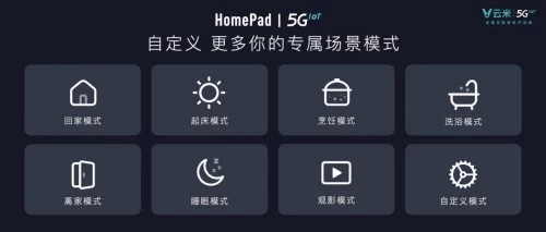 革命2:多种智能场景模式。HomePad 5GIoT内置离家模式、回家模式、看电影模式等多种智能场景模式,可瞬间实现多个产品的自动启停或调节,还能根据家庭喜好、个人习惯等实际情况进行专属模式自定义,充分满足每个家庭的个性化需求,便利程度不言而喻。