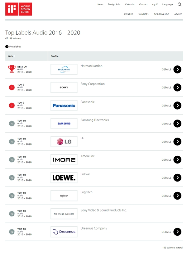 iF Design Award(iF国际产品设计大奖)由德国IF(International Forum Design)汉诺威国际论坛设计有限公司主办,诞生于1953年,至今已有60余年的悠久历史。它被公认为全球设计大赛最重要、最具公信力的奖项之一。本次公布的榜单是iF首次对历年获奖数目进行排名,1MORE能够在一种海外知名品牌中突围进入榜单TOP10,不仅是对1MORE耳机设计理念的认可,也象征了中国原创设计的崛起。