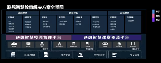 30余年的技术积累联想建立起一套“教学、教务、教研”智能化场景创新的智慧教育解决方案,覆盖“教、学、考、评、管”的教育系统的业务链条各环节,其中包括智慧教育、智慧课堂、智慧校园等关键应用和平台,拥有“战略调研—教育生态规划—基础设施建设—平台资源统筹—长期运营服务”的全链条服务实力。智能化场景解决方案紧紧贴近需求,能够切实有效地助力智慧教育落地。