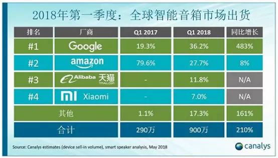 市场分析公司Canalys最近发布的报告显示,2018Q1全球智能音箱总体出货逾900万台,同比增幅接近210%,而中国智能音箱出货180万台,成为仅次于美国的全球第二大智能音箱市场。