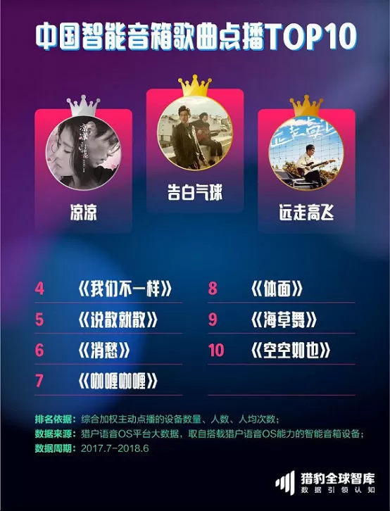 “猎豹全球智库”中国智能音箱歌曲月度飙升榜是基于5月中旬到6月中旬的歌曲点播热度增幅进行的排行,吴亦凡的《天地》、《LikeThat》两首歌曲上榜,创造101节目中的《摩天轮的眼泪》位居第三。《纸短情长》、《离人愁》等热门抖音歌曲同样受到智能音箱用户的喜爱。