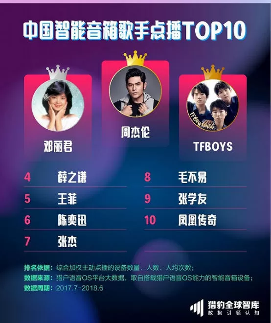 智能音箱市场目前最大驱动力是家庭、年轻的“X一代”女性以及父母。此前已有用户报告指出,智能音箱的用户群体中,有一半左右已婚已育,购买者更看重家庭使用场景,针对儿童、青少年群体的内容也是智能音箱内容生态中的重要组成部分。这也就不难解释TFBOYS排名第三的好成绩。