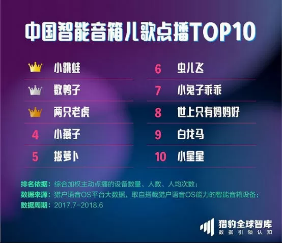 “猎豹全球智库”此次联合全链路远场语音交互系统“猎户语音OS”共同发布中国首个智能音箱内容点播热度排行榜,从年度热门歌曲、歌手、有声内容、儿童故事、儿歌、自然声音等维度来展示近一年以来中国智能音箱中的内容热力图。