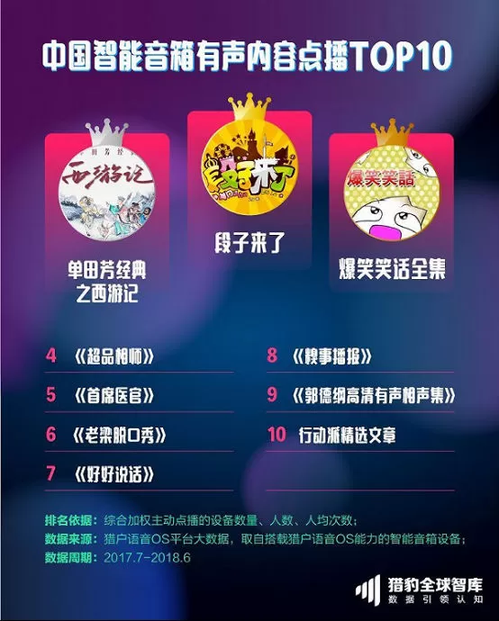 “猎豹全球智库”中国智能音箱有声内容点播TOP10中,脱口秀节目《段子来了》和传统经典《单田芳经典之西游记》名列前茅,有声书《超品相师》、《首席医官》分列第四、第五,郭德纲相声集名列第九。