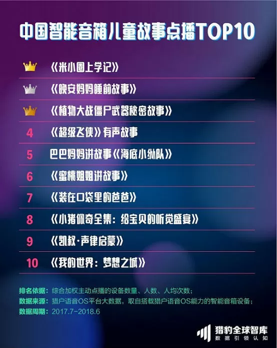 《米小圈上学记》、《小跳蛙》分获中国智能音箱儿童故事点播、中国智能音箱儿歌点播热度冠军。儿歌榜单中歌曲多为经典儿歌,相较之下,儿童故事排行竞争要更为激烈。《超级飞侠》、《小猪佩奇全集》、《凯叔·声律启蒙》等均榜上有名。