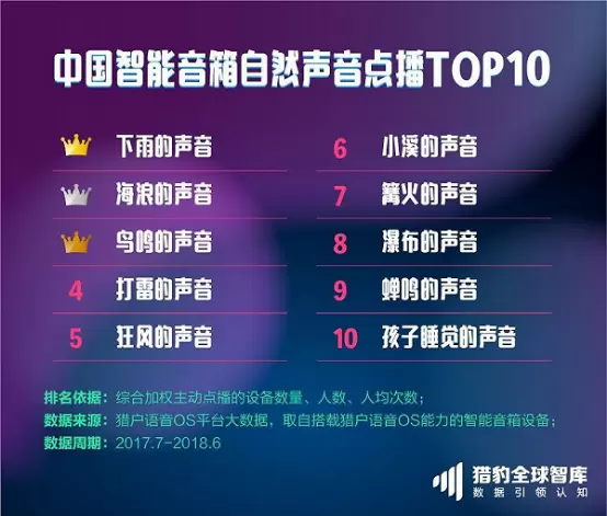 说到作为背景音和睡前播放,智能音箱中自然声音的点播也是一大亮点。“猎豹全球智库”中国智能音箱自然声音点播排行榜显示,下雨、海浪、鸟鸣是智能音箱用户点播频率最高的三个声音。