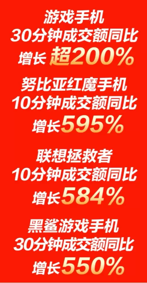 近些年,随着和平精英、王者荣耀、阴阳师、率土之滨等重度手游的普及,让玩家们对手机性能要求越来越高。在洞察消费者需求后,京东联合各大手机厂商推出一系列基于C2M反向定制的游戏手机。其中以ROG、黑鲨和努比亚红魔为代表的游戏手机一经上市就深受消费者追捧。根据京东11.11开门红战报显示,努比亚红魔手机10分钟成交额同比增长595%、联想拯救者10分钟成交额同比增长584%、黑鲨游戏手机30分钟成交额同比增长550%。由此可见,游戏手机正受到广大消费者的喜爱。