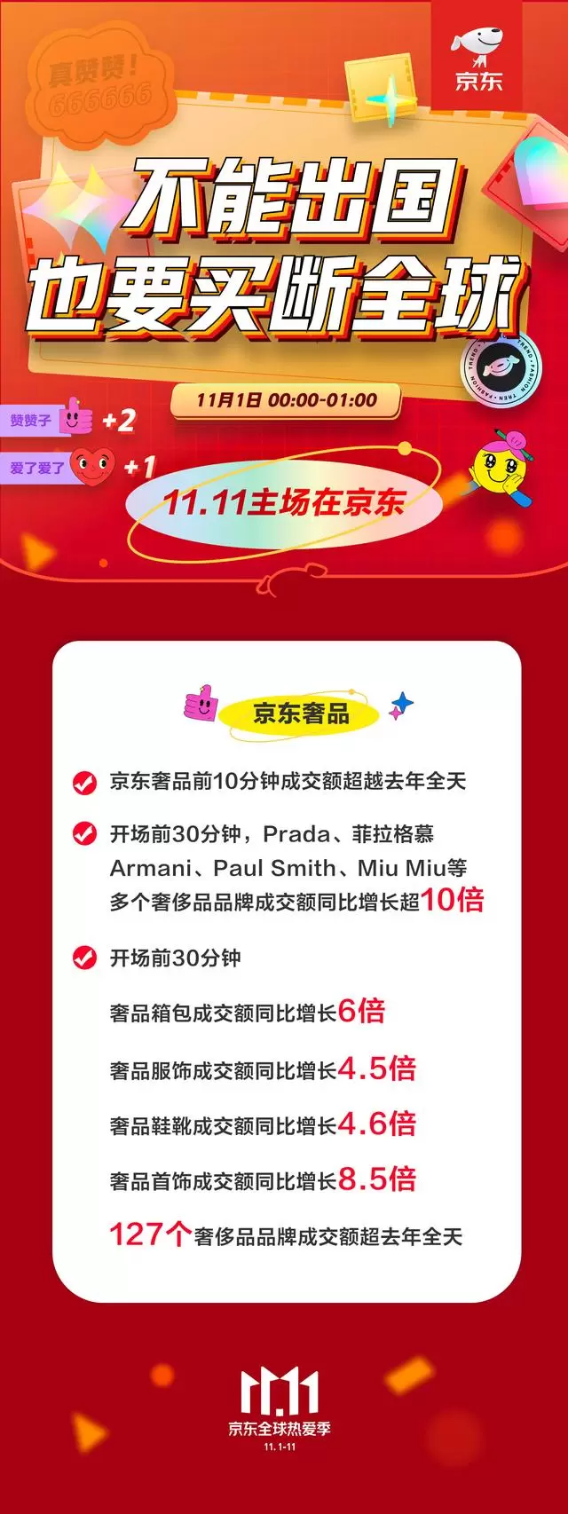 11月1日零点,2020京东11.11全球热爱季超预期火爆开场,尽显双十一主场的强大吸引力。今年因为特殊环境无法出国买包买鞋买衣服的广大"土豪"们,蜂拥至京东购买奢侈品,京东奢品前10分钟成交额超越去年全天。Prada、菲拉格慕、Armani、Paul Smith、Miu Miu等多个品牌仅30分钟同比增长超10倍。