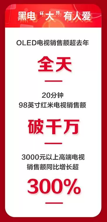 平板电视品类中大屏化的趋势愈发明显,比单人床面积还大的98英寸红米电视在20分钟内成交额突破1000万元,高画质的OLED电视半小时内成交额就超过去年全天,同一时间3000元以上的中高端平板电视成交额同比超过300%。