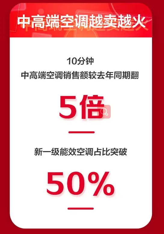 虽然已近冬日,但空调品类的销售仍然异常火爆,节能成为消费者高度关注的技术指标。11月1日前10分钟,中高端空调成交额较去年同期增长5倍,前30分钟,新一级能效空调在空调整体成交额中占比突破50%。