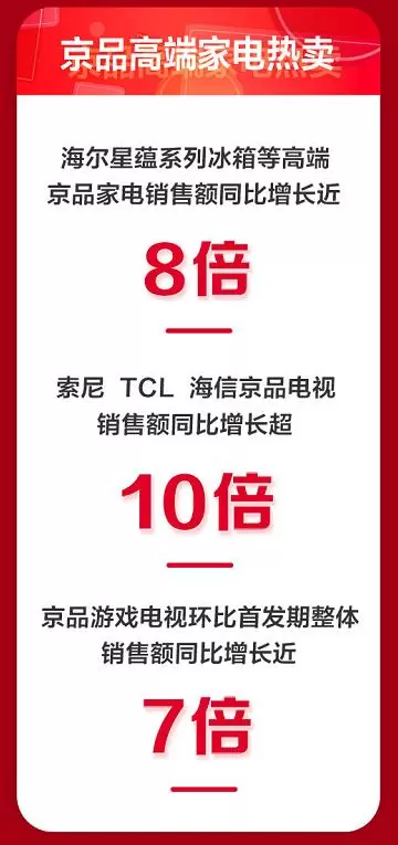 满足消费者个性化需求的反向定制京品家电销售不断攀上高峰,0点过后的前半小时,成交额同比增长5倍以上。其中,以卡萨帝、西门子、LG为代表的冰洗高端品牌和海尔星蕴系列冰箱等高端产品成交额同比增长近8倍。索尼、TCL、海信等品牌的京品电视成交额同比增长超过10倍。新上市备受游戏爱好者青睐的京品游戏电视系列,环比首发期间成交额增长近7倍。