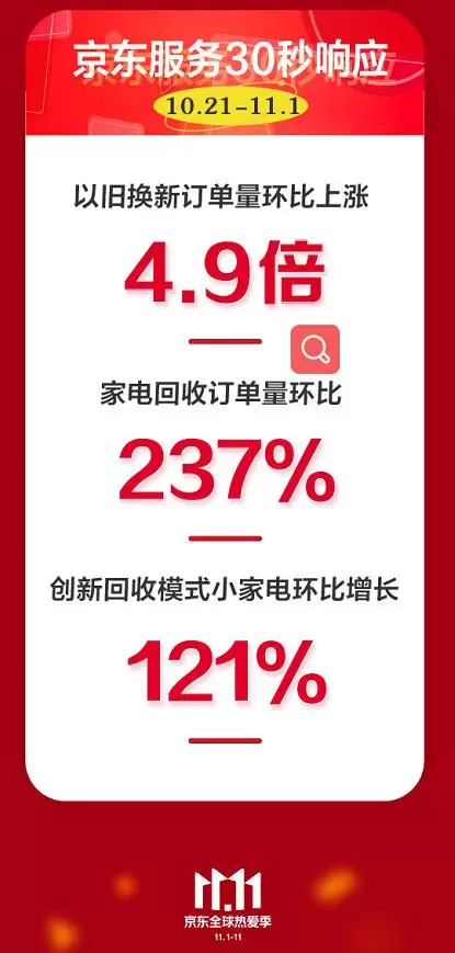 高达10亿元的以旧换新补贴在今年的京东11.11大促中让很多消费者大呼"真香",11月1日0点后的半个小时中,京东家电创新的一站式以旧换新服务订单成交额环比大增4.9倍,家电回收订单环比增长237%,创新的小家电回收模式带来的成交额环比增长121%。