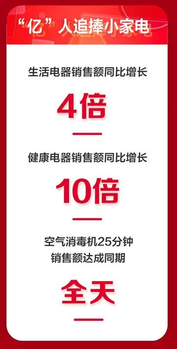 小家电迎来高光时刻,只用了30分钟,电饭煲销量就突破8万台,生活电器成交额同比增长超过4倍。其中空气消毒机25分钟就达到去年全天成交额,健康电器成交额同比增长10倍。小家电消费升级趋势明显,中高端吸尘器和扫地机成交额同比都增长超过100%,中高端净水器28分钟就达到去年全天成交额。洗地机作为新兴产品,30分钟就超去年11月全月成交额,实现井喷式增长。戴森吸尘器只用5分钟就达到去年全天成交额,石头扫地机器人半小时的成交额就达到去年全天的1.5倍,科沃斯扫地机器人成交额同比增长300%以上。