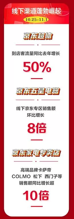 从京东11.11正式开启前的预售期,京东电器城市旗舰店和京东五星电器就开始协同线上主站节奏,为消费者提供沉浸式体验和线下服务。10月25日-11月1日,京东五星电器的京东专区成交额环比增长超过8倍。京东电器城市旗舰店在昆明、苏州(试营业)、南京、马鞍山、蚌埠、焦作、德阳等城市展示出了地标级的影响力,客流是当地传统家电卖场的3倍以上,沉浸式购物体验让消费者平均停留时长比传统卖场提高40%。