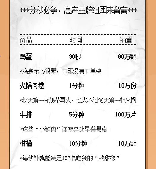 虽号称 “高产王牌军团”,这一次仍然无法抵挡广大吃货们的热情。母鸡表示吃货们真是分秒必争,用30秒就掠夺了60万颗鸡蛋,下蛋还没有下单快心太累;火锅肉卷用1分钟销售10万份的成绩傲视秋天的第一杯奶茶,试问谁能抵挡冬天第一顿火锅的魅力?牛排则留言称5分钟已有100万片“小鲜肉”连夜奔赴早餐餐桌,紧随其后的柑橘也不甘示弱,10分钟销售10万颗,每秒钟都在为了满足167名吃货的“酸甜欲”战斗不息。