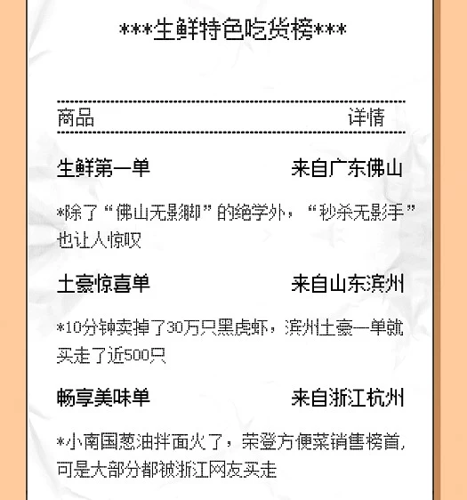 让京东生鲜军团瑟瑟发抖、又不得不紧急装箱打包出库的吃货们来自哪里呢?抢到生鲜第一单的是来自广东佛山的用户,他们用行动证明了除了“佛山无影脚”,“秒杀无影手”同样是民间绝技,山东滨州土豪一单就买走了近500只黑虎虾,来自浙江的网友也迫不及待地一举把小南国葱油拌面推上方便菜榜单的NO.1。